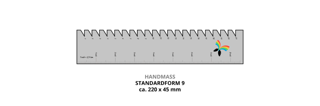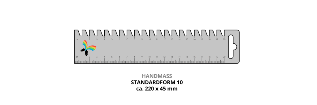 Ob professionelle Schneiderei, Stofflieferant oder Näh-Blog. Wenn es um das Thema Nähen und den Schneiderbedarf geht, taucht ein Nähzubehör immer wieder auf: das Handmaß. Ebenfalls wird dieses auch als Saummaß oder Zackenhandmaß bezeichnet. Ein kleines Lineal mit praktischen Features. Dieses Näh-Werkzeug stellen wir in unserer Druckerei mit Ihrem Logoeindruck her. Gefertigt aus flexiblem, abwaschbarem Kunststoff ist dies sowohl leicht als auch robust und schmiegt sich perfekt an den Stoff an. Ihr Handmaß bedrucken wir nicht nur einseitig sondern auch beidseitig. Sowohl die Außenkontur als auch weitere Aussparungen und Einkerbungen – beispielsweise für Knopflöcher – fertigen wir individuell nach Ihren Wünschen. Darüber hinaus bieten wir zwei Standardformen an. Ob Sonderform oder Standard: Unser Handmaß ist vollständig made in Germany.